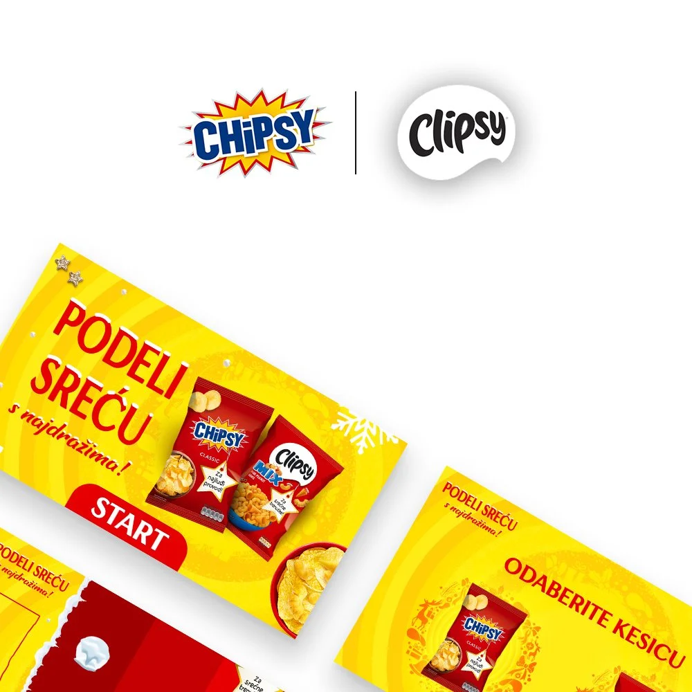As part of the new year campaign, Chipsy and Clipsy in addition to standard digital and printed materials in 2021 for the first time integrate an interactive game into mobile advertisements through the AdColony platform, which allows the user to play games of given brands after viewing the ad. The very principle of the game is defined by the parameters of the platform, which defines two active buttons with which the user moves through 3 paths and a game that, in concept reminds of old-school games in which it is necessary to collect as many falling points as possible and at the same time avoid items that give negatives.
